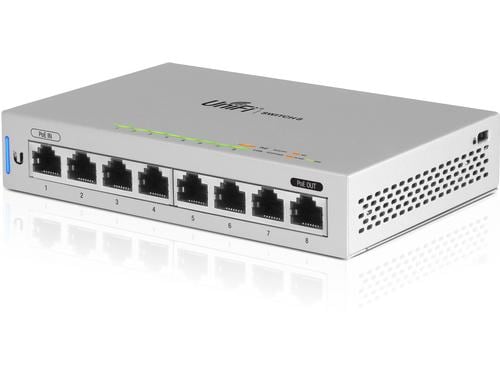 Der US-8 Switch ermöglicht die einfache Integration weiterer Netzwerkgeräte, während die Stromversorgung zu Ihren PoE-Geräten aufrechterhalten bleibt. Bei Betrieb über PoE 802.3at liefert er PoE Out nach 802.3af-Standard. Wenn der Switch über das Netzteil betrieben wird, unterstützt er auf Port 8 Passive PoE mit 48V (2-pair).