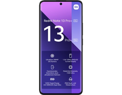 Das Redmi Note 13 Pro+ überzeugt mit umfassender Konnektivität: 5G, Wi-Fi 6E, Bluetooth 5.3, NFC und GPS bieten modernste Vernetzungsmöglichkeiten. Für optimalen Sound sorgen zwei Stereo-Lautsprecher mit Dolby Atmos. Mit einem 5000 mAh Akku und 120W Schnellladefunktion ist das Smartphone blitzschnell aufgeladen und bietet eine zuverlässige Akkulaufzeit. Dank IP68-Zertifizierung ist es zudem vor Staub und Wasser geschützt, sodass es auch für abenteuerliche Aktivitäten bestens gerüstet ist.
